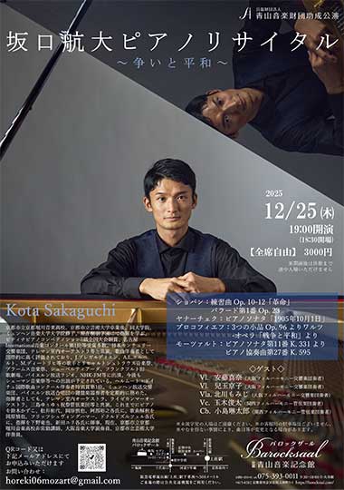 | チケット販売 | ◎青山音楽記念館 ☎075-393-0011 ◎予約フォーム ◎E-mail:horeki06mozart [at]gmail.com ※[at]を@に書き換えて送信してください。 ※未就学児入場不可 ※本公演は、オンラインチケットサービス(インターネット購入)ではお取り扱いしておりません。 (オンラインチケットサービスは主催公演のみ対象となります) |