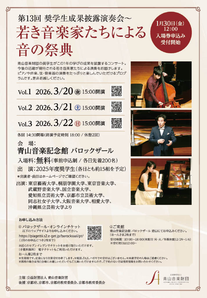 2013年4月より、公益財団法人 青山音楽財団が新たに取り組み始めた「奨学金事業」。これは音楽大学又は音楽学部に在籍する学生を支援するために、奨学金を支給するものです。 ◆後援:京都府、京都市、京都府教育委員会、京都市教育委員会 |