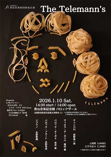 | 出演者 | 永野 歌織(ソプラノ) 永野 伶実(バロック・フルート) 荒井 豪(バロック・オーボエ) 頼田 麗(ヴィオラ・ダ・ガンバ) 西野晟一朗(チェンバロ) |